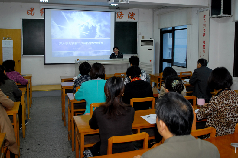 魏群副教授在辅导报告中,结合参加中央党校培训的成果,分别从如何理解全面推进依法治国的总目标和重大任务、应当掌握的相关法律知识点和“依法治国”的重大意义等三个方面,畅谈了对党的十八届四中全会精神的学习体会。通过她细致地解读和生动地讲解,进一步加深了广大教职员工对党的十八届四中全会精神的理解,对于贯彻落实好四中全会精神起到了积极的促进作用。