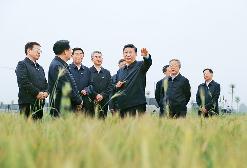 2021年9月13日至14日,中共中央总书记、国家主席、中央军委主席习近平在陕西省榆林市考察。这是13日下午,习近平在米脂县银州街道高西沟村临时下车,察看粮食作物长势,同正在田间劳作的老乡拉家常。新华社记者 李学仁/摄