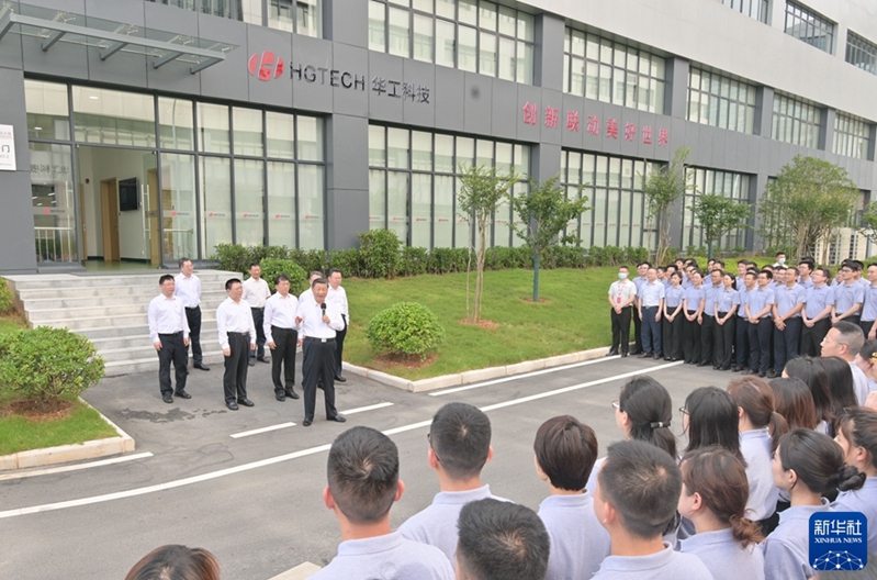 6月28日,中共中央总书记、国家主席、中央军委主席习近平在湖北省武汉市考察。这是28日下午,习近平在武汉华工激光工程有限责任公司车间大楼前,同企业职工亲切交流。新华社记者 李涛 摄