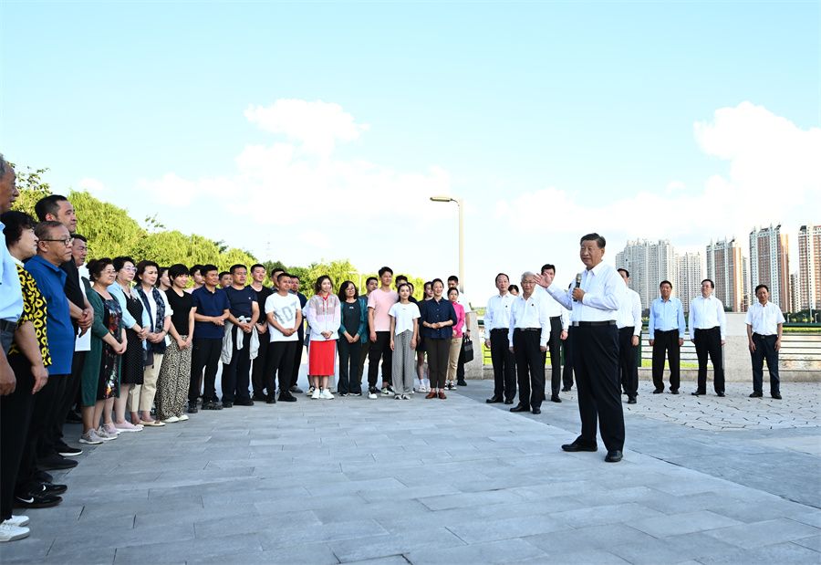 8月16日至17日,中共中央总书记、国家主席、中央军委主席习近平在辽宁考察。这是16日下午,习近平在锦州市东湖森林公园察看小凌河沿岸生态环境时,同正在休闲、进行文化活动的群众亲切交流。新华社记者 燕雁/摄
