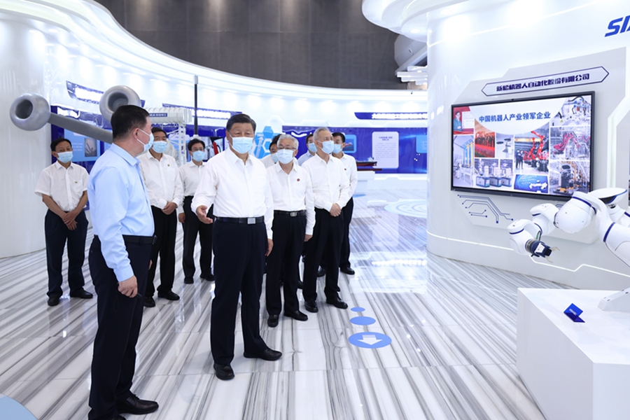 2022年8月16日至17日,中共中央总书记、国家主席、中央军委主席习近平在辽宁考察。这是17日下午,习近平在沈阳新松机器人自动化股份有限公司展厅,了解公司生产经营、自主创新情况。新华社记者 鞠鹏/摄