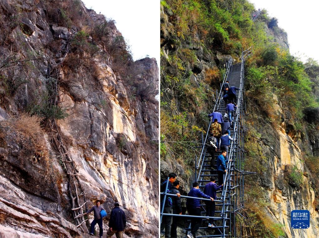 拼版照片:左图为2013年2月22日拍摄的四川省凉山彝族自治州昭觉县“悬崖村”阿土勒尔村的藤梯;右图为2016年11月29日,在四川省凉山彝族自治州昭觉县,人们沿着刚建好的钢梯登上“悬崖村”。新华社发(阿克鸠射摄)