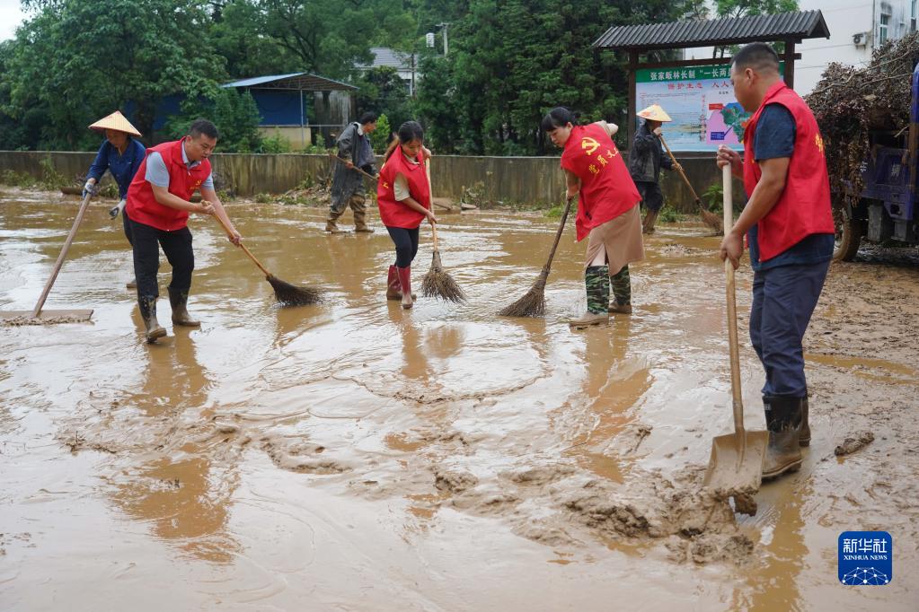 2022年6月21日,在江西省德兴市泗洲镇张家畈社区,党员干部在清理淤泥和垃圾。新华社记者 周密摄