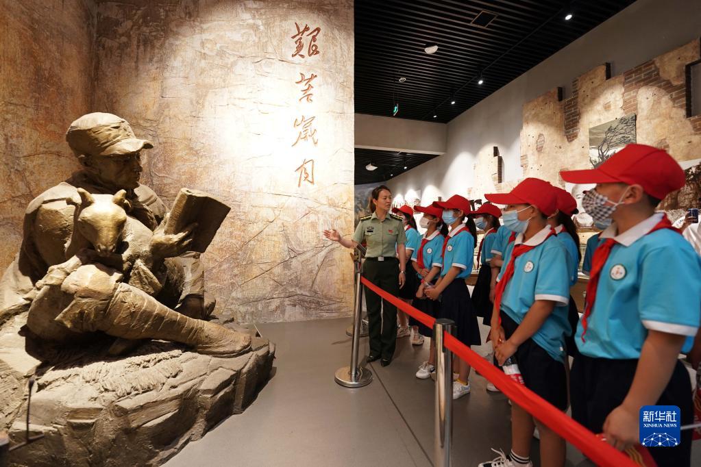 2021年5月30日,在位于河北省邢台市信都区浆水镇的中国人民抗日军政大学陈列馆,工作人员向小学生们讲述抗大历史。新华社记者 牟宇摄