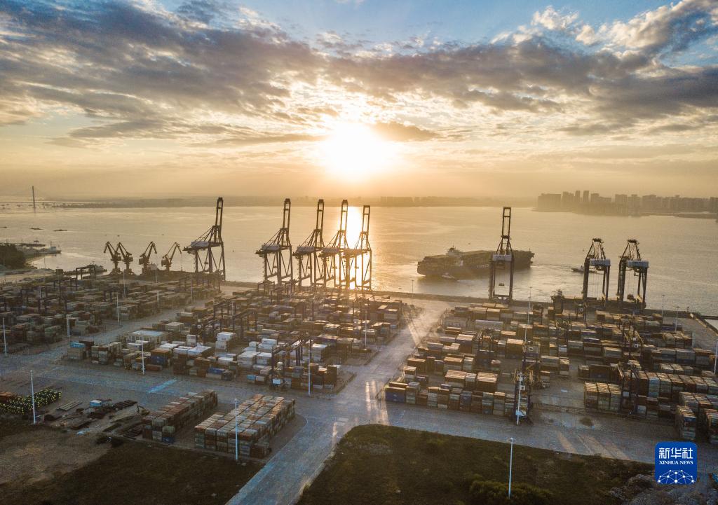 这是2021年12月5日清晨在海南自贸港重点园区洋浦经济开发区拍摄的洋浦国际集装箱码头(无人机照片)。新华社记者 蒲晓旭摄