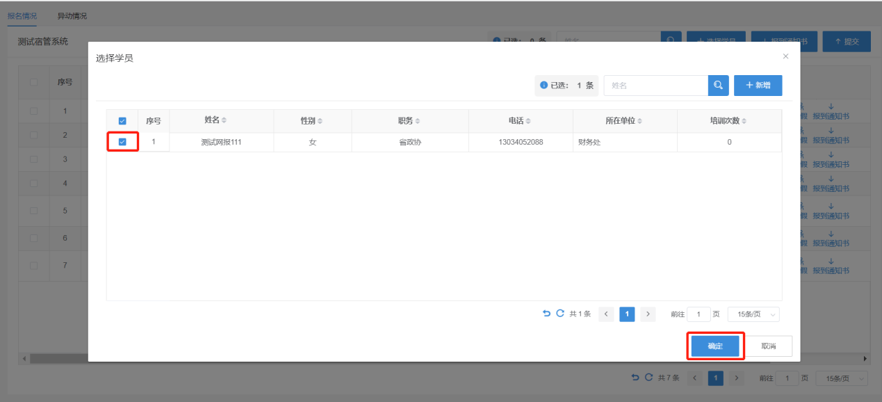 4.勾选需要参加培训的学员,点击“确定”键,弹出“报名主页面”。