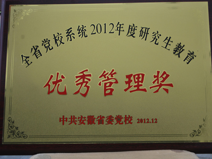 2012年12月12日,在安徽省委党校召开的2013年研究生招生暨班主任工作研讨会上,我校荣获了2012年度研究生教育优秀管理奖,受到了表彰。此次获奖,我校是属于在全省17所市直党校中仅4家获奖的单位之一。如此殊荣,这是全校努力的结果,是省委党校对我校研究生管理工作的鼓励和肯定。